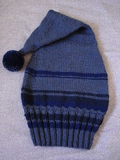 Ich habe 100 Maschen angeschlagen, die ersten Runden li/re gestrickt, dann glatt rechts. Bei der Abnahme habe ich nach 50 Maschen einen Markierungsfaden eingezogen und bei jeder dritten Runde auf beiden Seiten zwei Maschen zusammengestrickt. Deshalb entstanden auch die zwei Streifen, die bis zum Zipfel hochgehen (die Streifen waren eigentlich nicht so gewollt, hab aber keine andere Idee zur abnahme gehabt ;-) ).